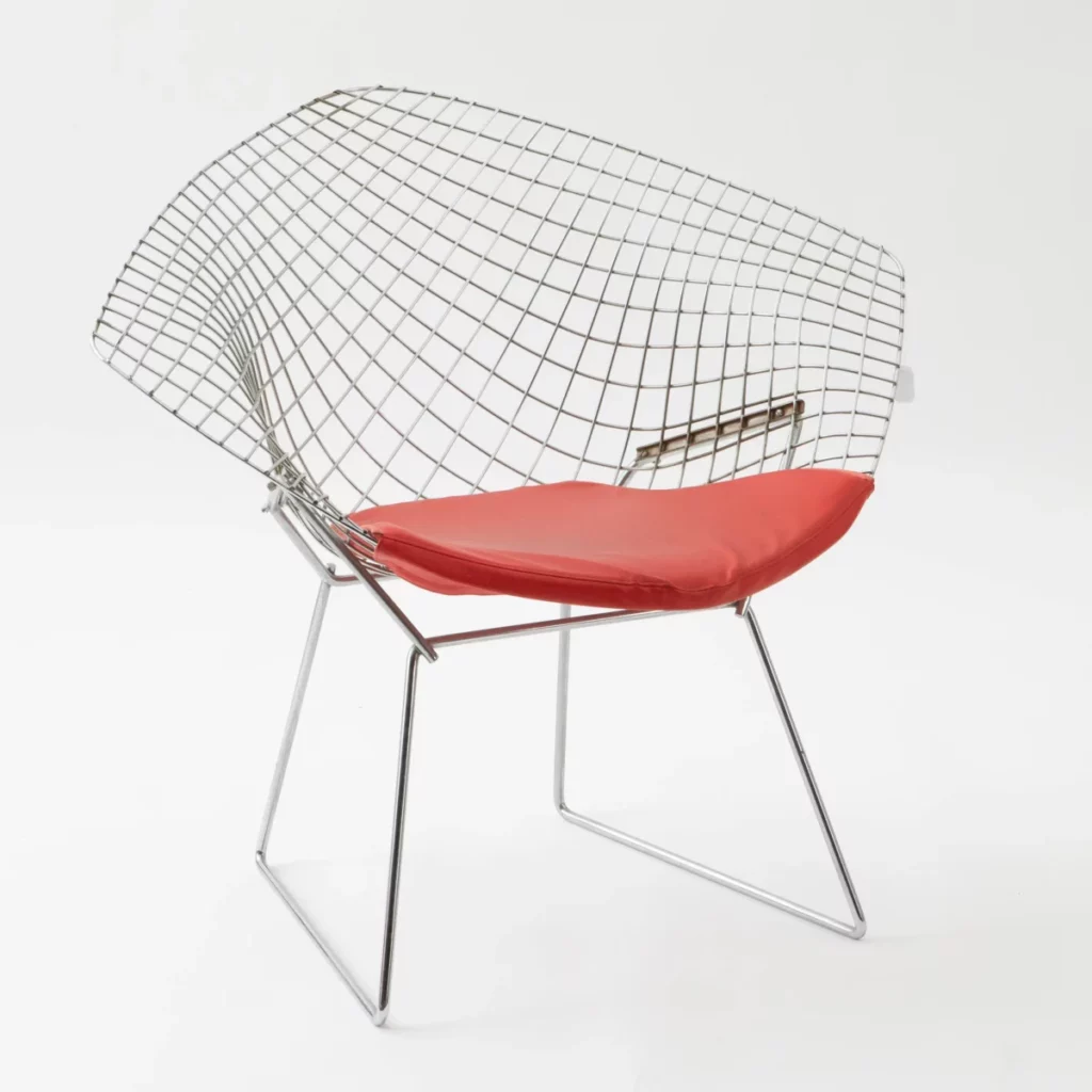 Harry Bertoia’s Diamond and Wire chairs (1952) illustrate Cranbrook’s unique approach. They are neither functionalized sculptures nor decorated seats, but a perfect fusion of both. The welded steel wire structure creates a transparent volume, a sculpture of lines in space that happens to also be a comfortable seat.