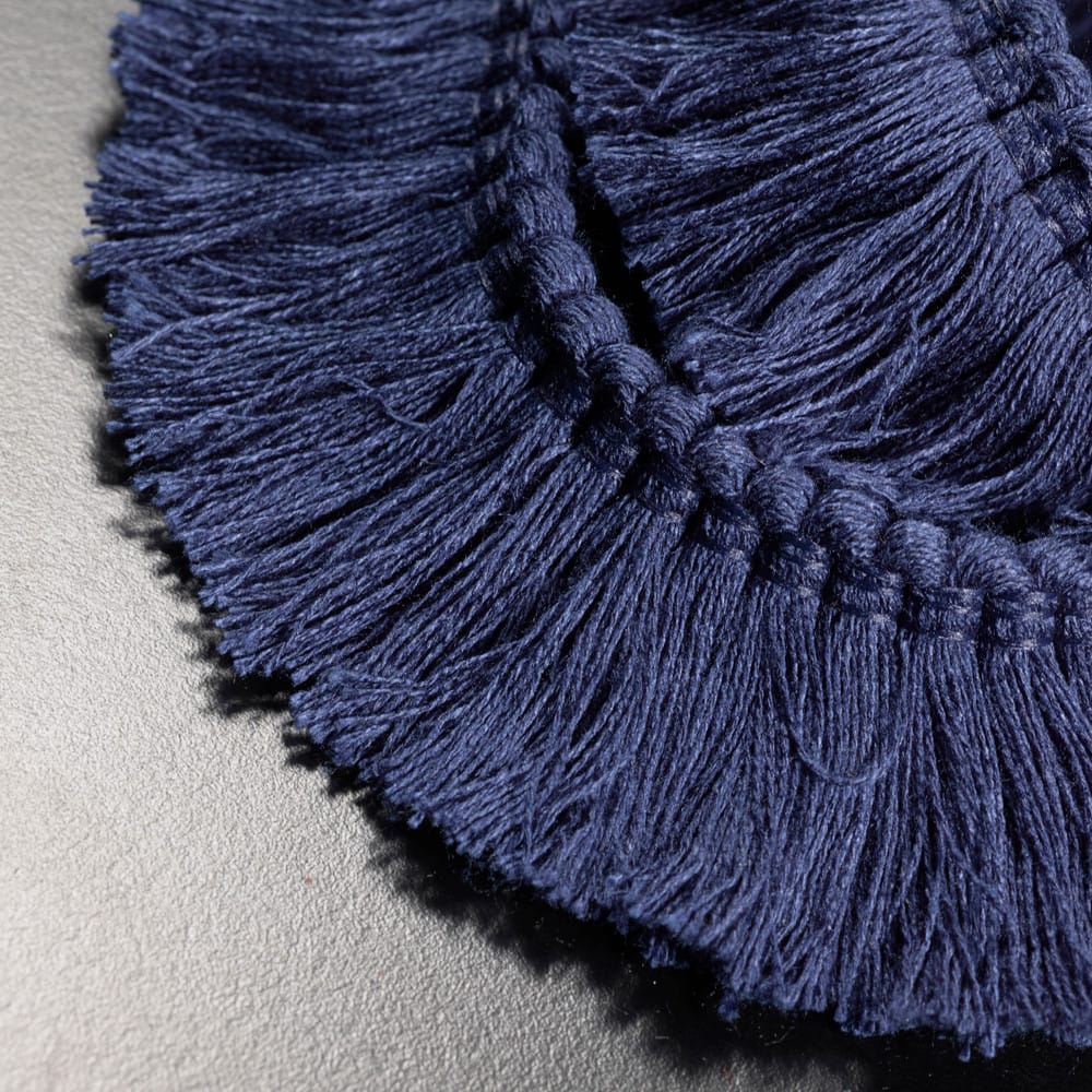 Les franges bouillonnées complexes, les crépines élaborées, les effilés sophistiqués restent rares en version outdoor. La raison technique : ces constructions demandent des fils très fins et souples, difficiles à obtenir avec des fibres synthétiques épaisses.
