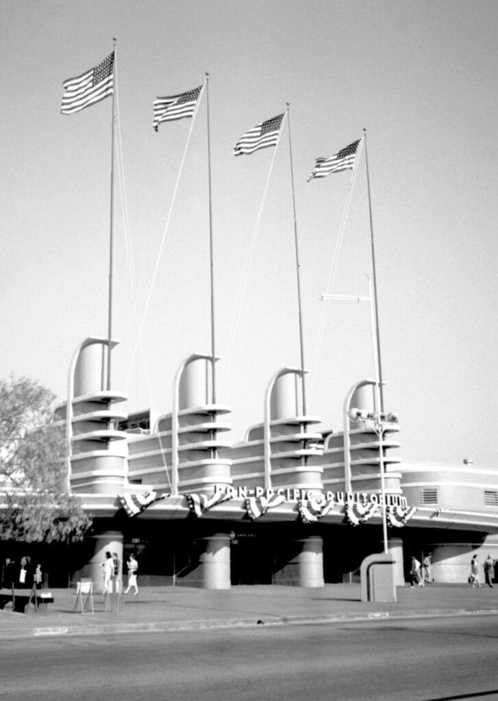 L’architecture cinématographique adopte massivement le Streamline. Des milliers de salles Art Déco sont rénovées en style Streamline dans les années 1930-40, d’autres construites ex nihilo. Façades courbes, néons, marquises profilées créent une architecture du spectacle et de l’évasion.