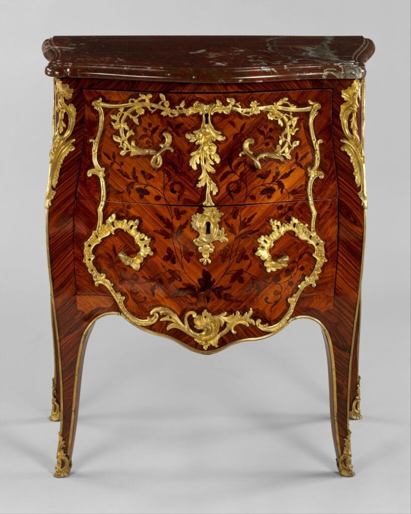 Louis XV tardif : la composition peut être plus équilibrée, mais l’ornement reste souvent rocaille et peut conserver une logique asymétrique.