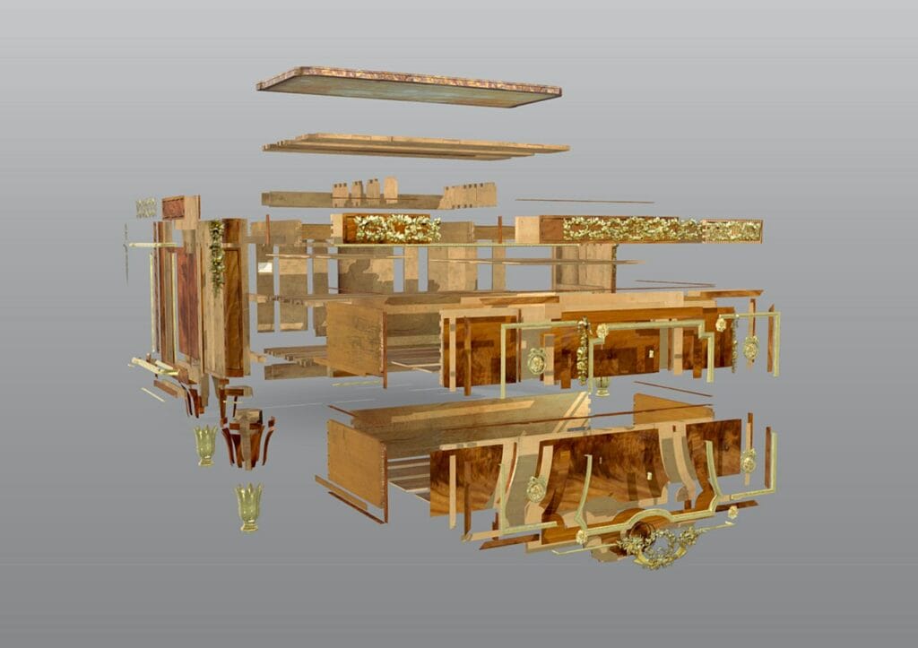 Sa marqueterie extraordinaire mêle motifs floraux, trophées, attributs des arts. Ses mécanismes secrets, ses bronzes somptueux révèlent une technicité inégalée. Conservé au château de Versailles, il demeure l’icône du style.